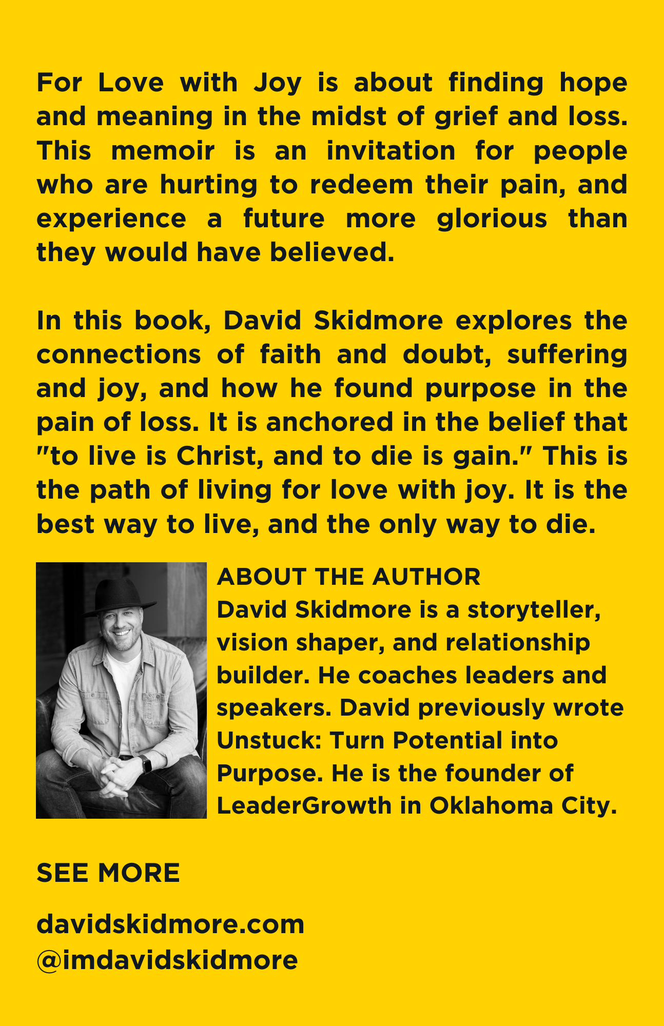 In this book, David Skidmore explores the connections of faith and doubt, suffering and joy, and how he found purpose in the pain of loss. It is anchored in the belief that "to live is Christ, and to die is gain." This is the path of living for love with joy. It is the best way to live, and the only way to die.